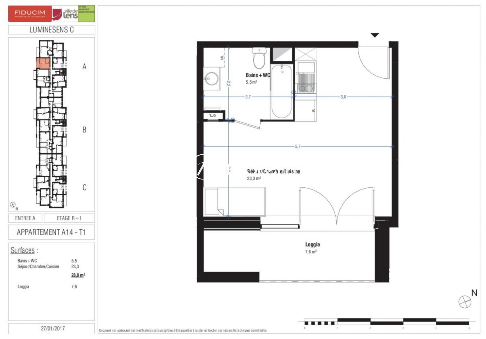 LENS - Dans la Résidence LUMINESENS, vous est proposé un appartement T1 n°A14 de 28.80m² situé au 1er étage avec ascenseur du bâtiment C. Il comprend une pièce de vie avec coin cuisine A/E (four, hotte, meuble haut et bas, évier inox et 2 plaques vitrocéramiques) et une salle d'eau avec WC. Chauffage individuel électrique et eau froide individuelle. Eau chaude, entretien parties communes, ascenseur et espaces verts communs, compris dans les provisions sur charges mensuelles et donnant lieu à une régularisation annuelle. Parking N° 26 au sous sol
