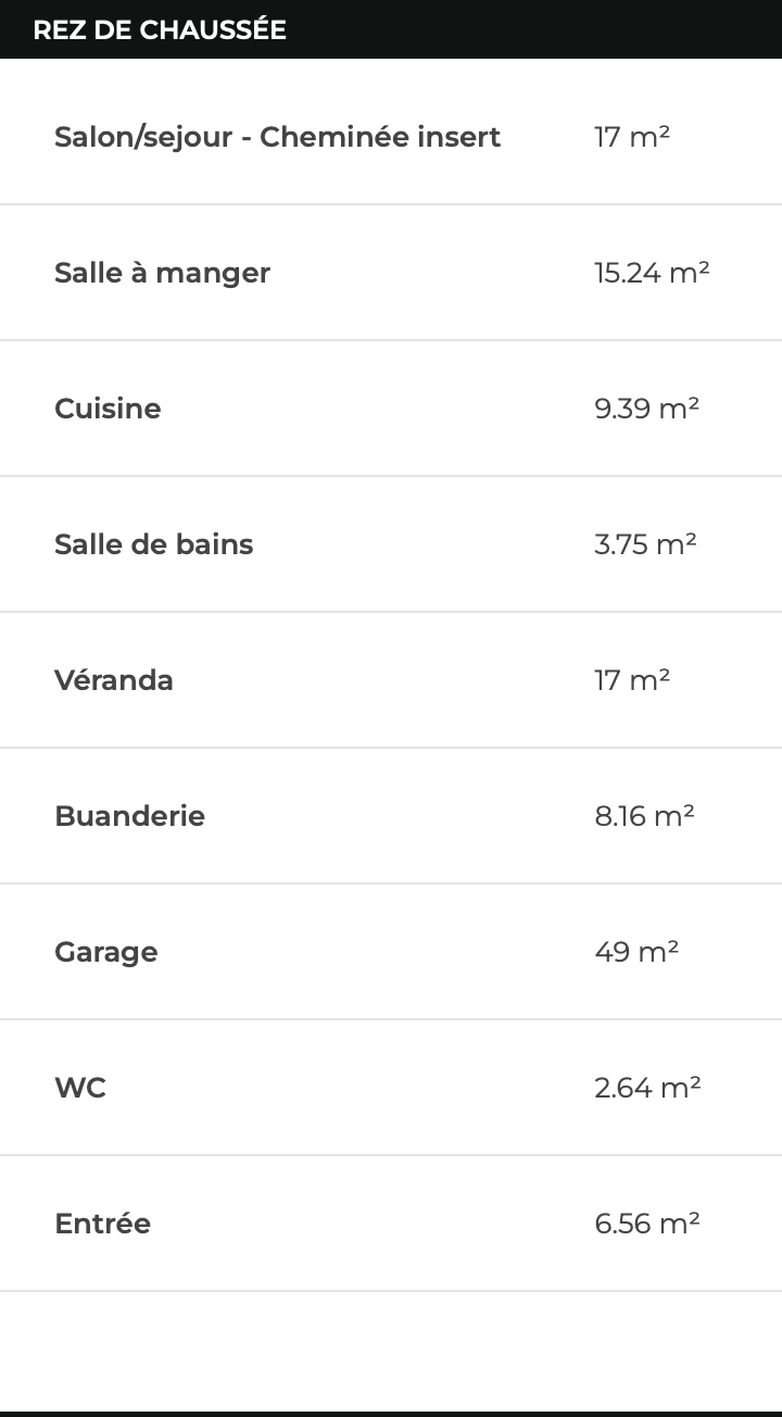 Hall, salon avec cheminée feu de bois, salle à mannger, cuisine aménagée et équipée ouverte sur la véranda. Egalement, buanderie, wc, et salle d'eau.